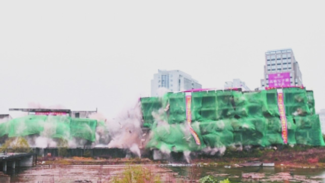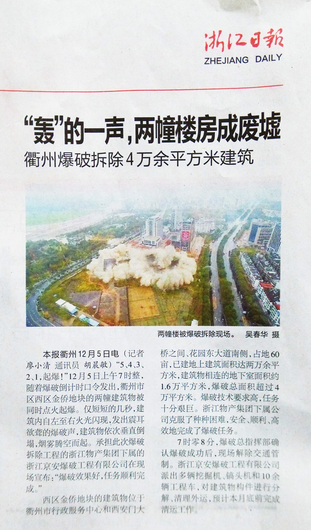 “5、4、3、2、1,起爆!”12月5日上午7时整,随着爆破倒计时口令发出,衢州市区西区金侨地块的两幢建筑物被同时点火起爆。仅短短的几秒,建筑内自南至北火光闪现,发出一阵阵连续清脆的爆破声,建筑物依次垂直倒塌,烟雾腾空而起。承担此次爆破拆除工程的浙江物产集团下属的云开平台官网在现场宣布:“爆破效果良好,任务顺利完成!”