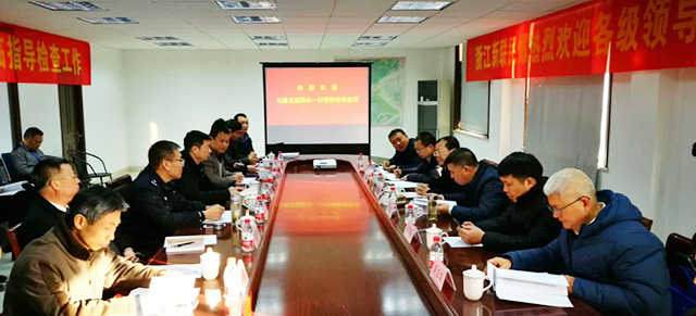 公安部三局马维亚副局长、浙江省公安厅金伯中副厅长(右三)共同出席在项目部会议室召开的现场混装炸药观摩座谈会
